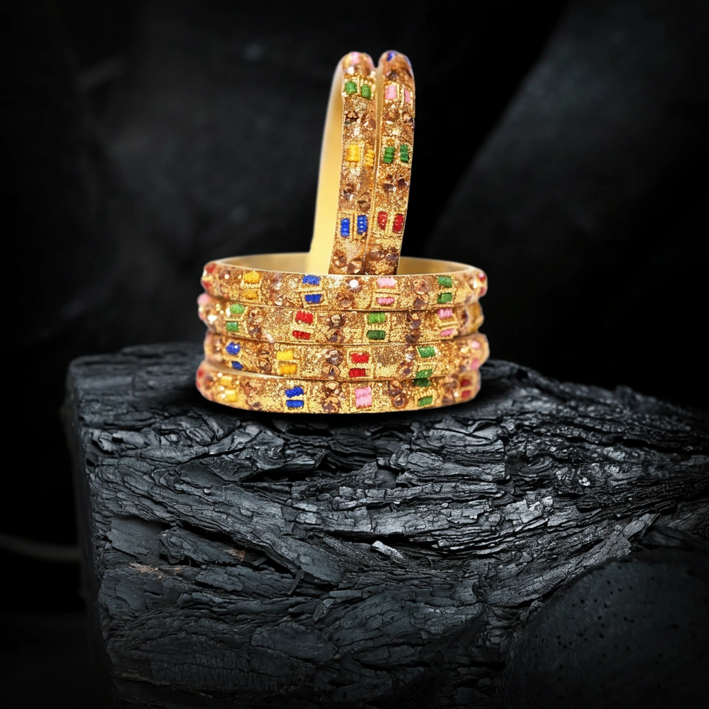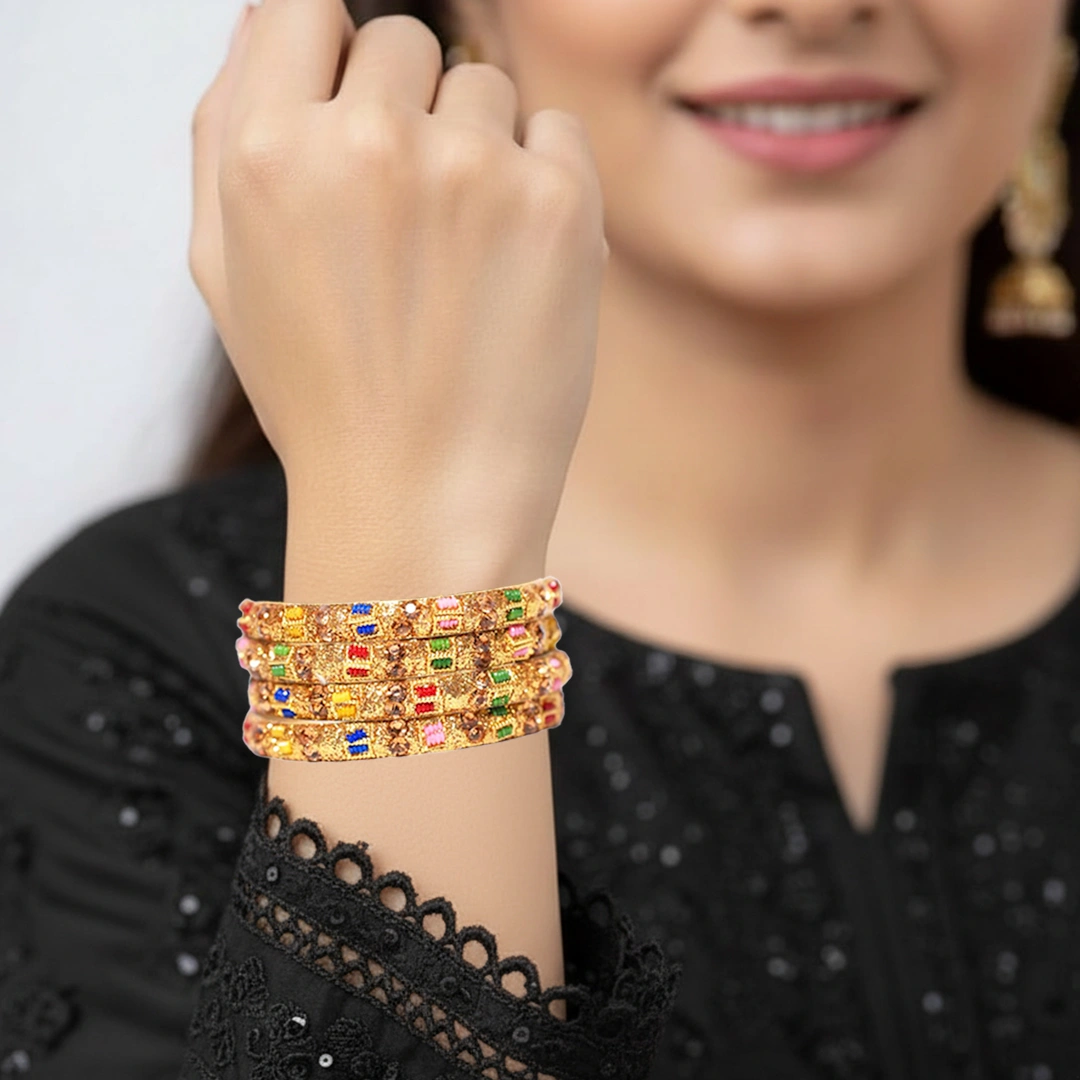 Turn heads with this vibrant set of gold-finished bangles, featuring intricate designs and colorful gemstone accents. Perfect for weddings, festive events, or adding a bold cultural flair to any outfit.