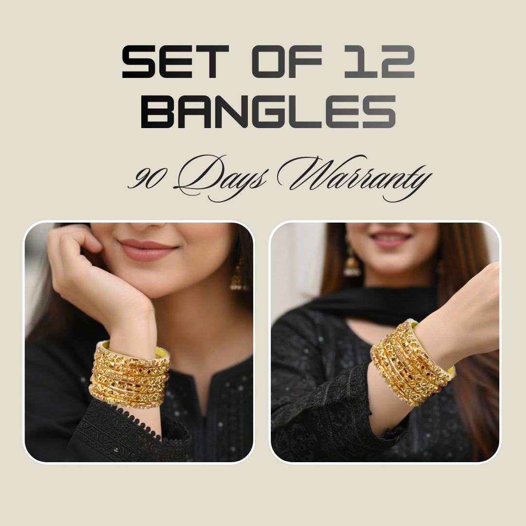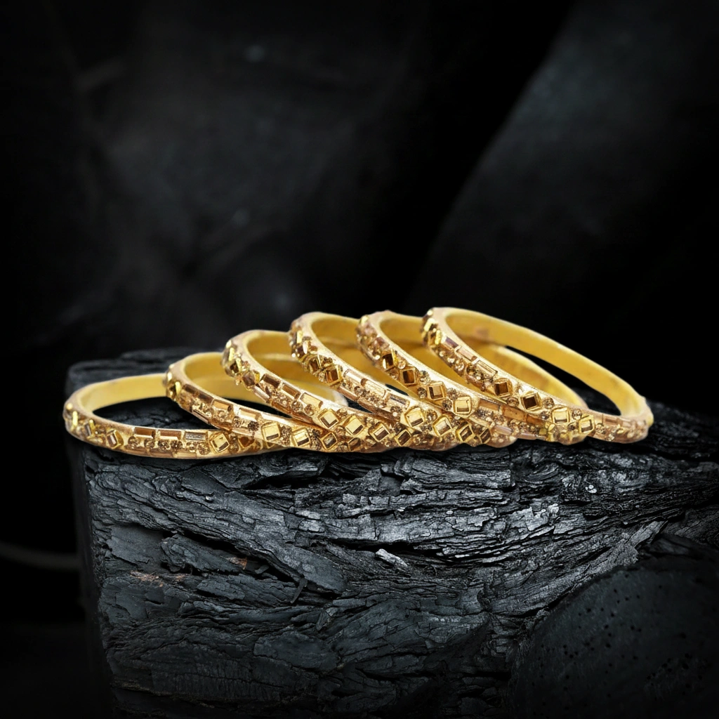 Add royal charm to your wrists with this intricately carved golden bangle set – perfect for festive elegance. This classic golden bangle set features beautifully detailed geometric patterns, adding texture and sparkle to your everyday or festive look. Lightweight yet bold, these bangles are a timeless accessory that pair effortlessly with both traditional and modern outfits.