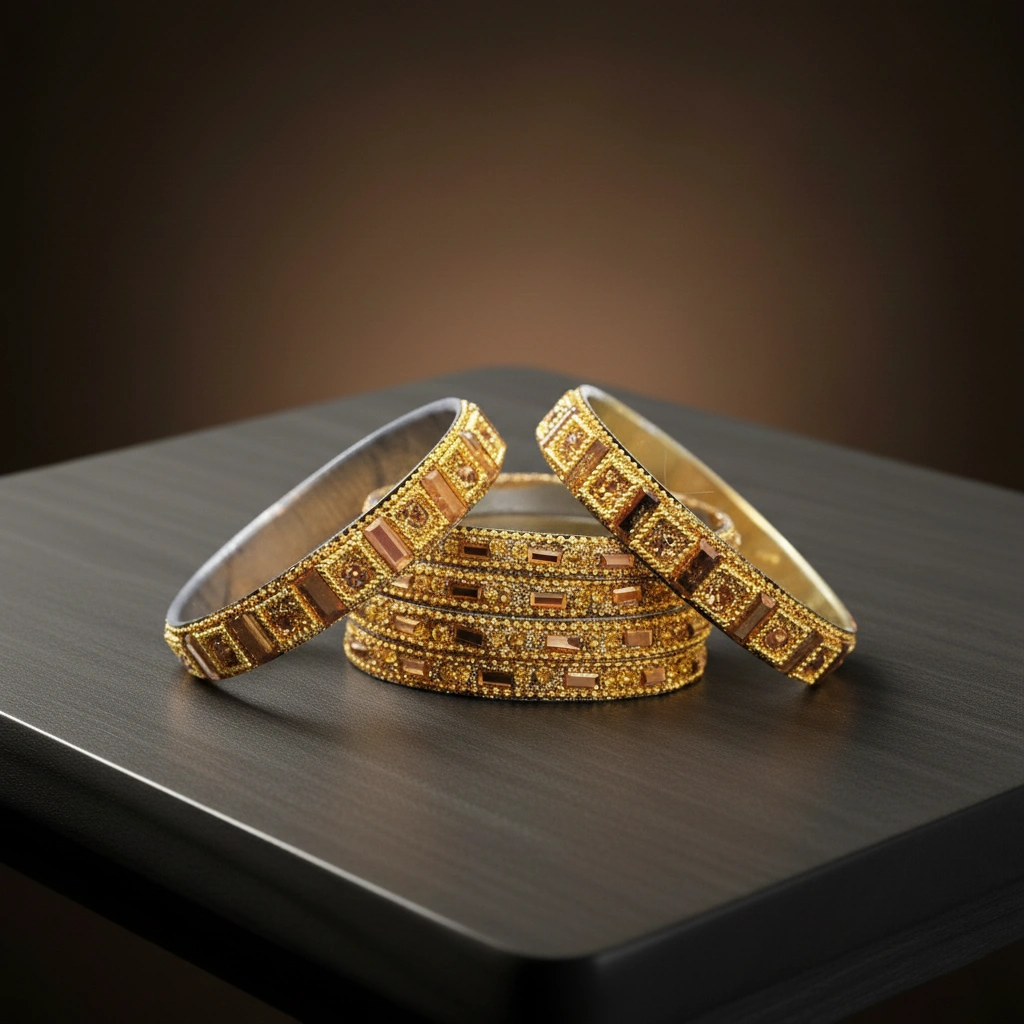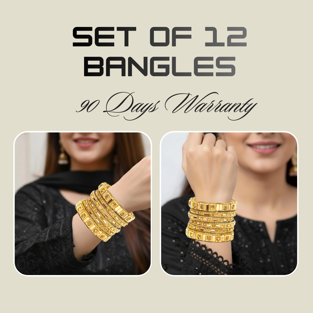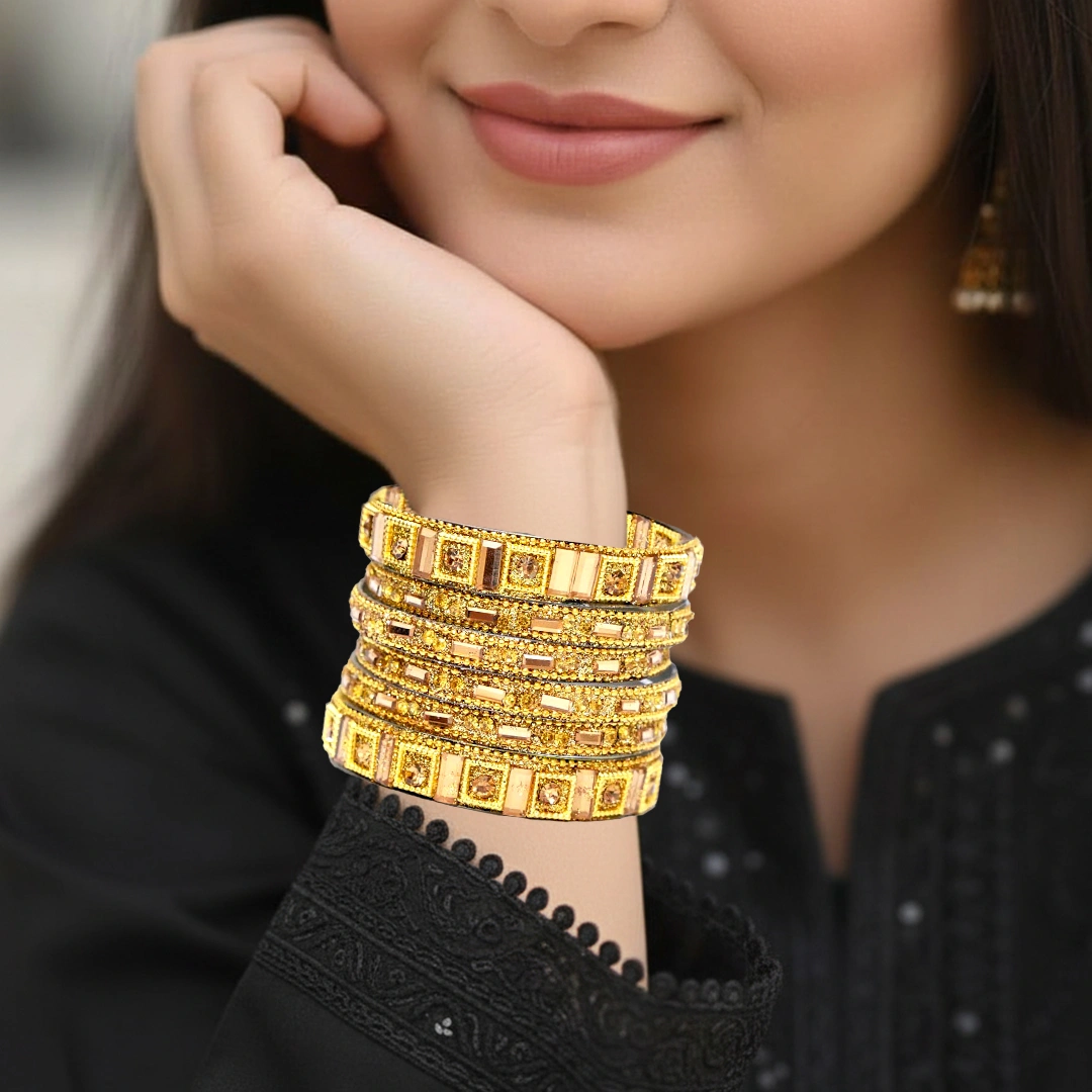 Step into opulence with this intricate set of gold-toned bangles, designed with alternating square and rectangular motifs accented by fine beadwork and reflective detailing. The symmetrical pattern gives it a mosaic-like elegance, while the warm golden sheen adds timeless allure. Whether paired with festive attire or worn as a standout accessory, these bangles offer the perfect balance of tradition and modern sophistication.
