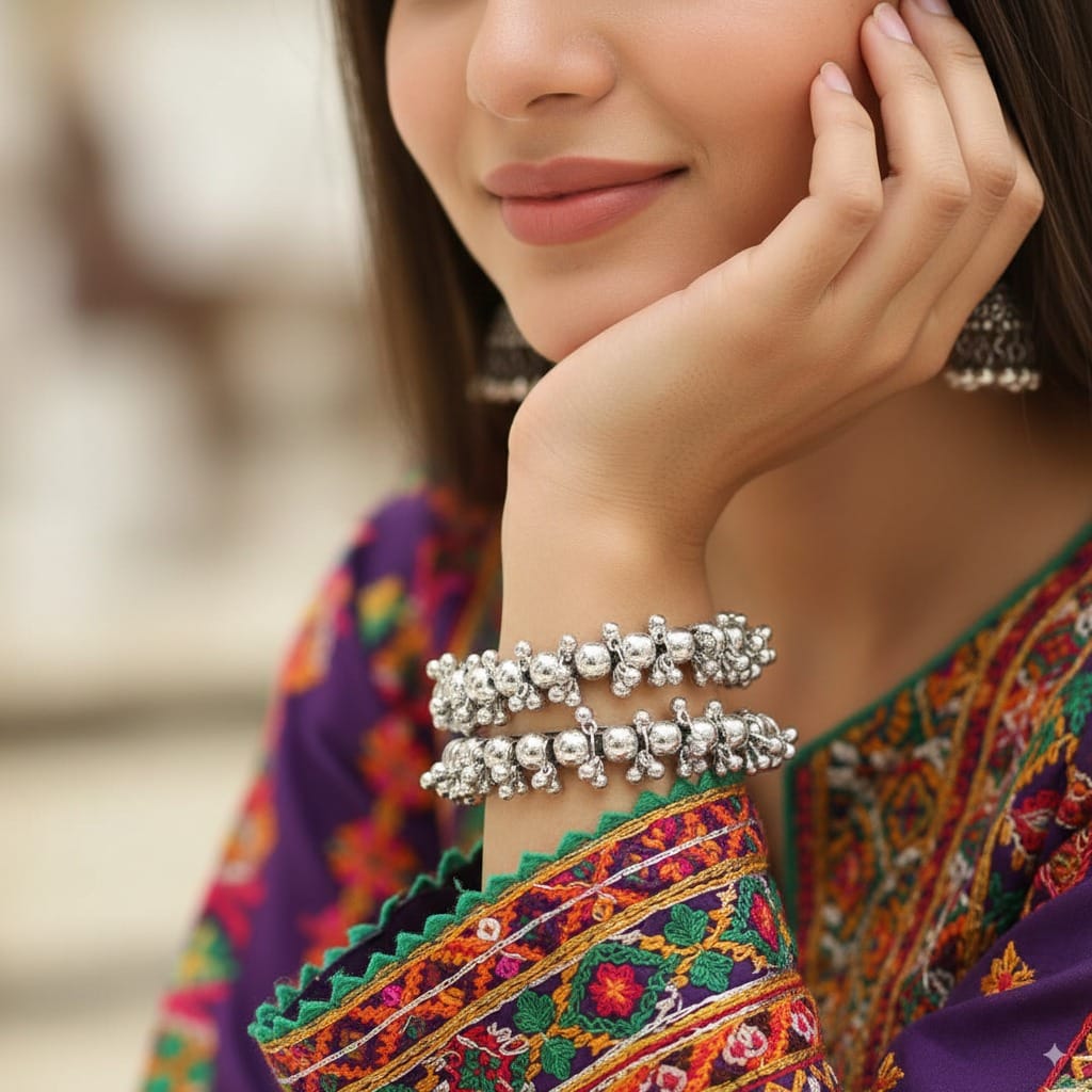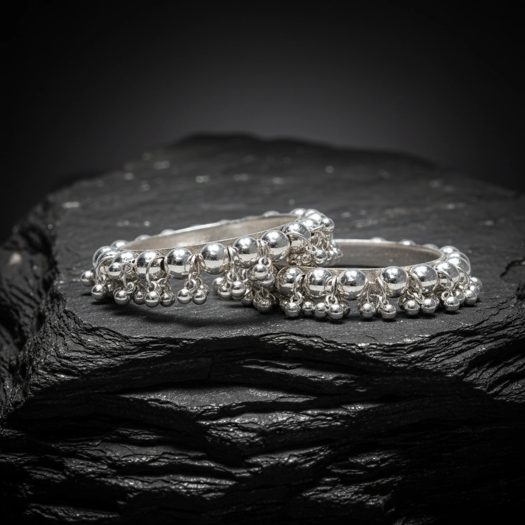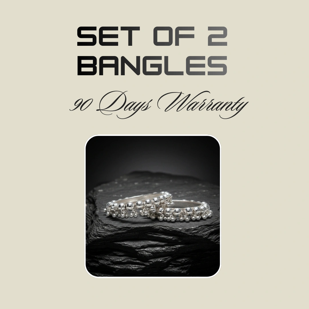 Refined and rhythmic, this graceful set of silver bangles is a timeless expression of South Asian craftsmanship. Each piece is adorned with clusters of delicate spherical beads that dangle along the outer rim, creating soft movement and traditional charm with every flick of the wrist. The full-circle design features rich texture and high-shine brilliance, perfect for layering or wearing solo as a statement of elegance.