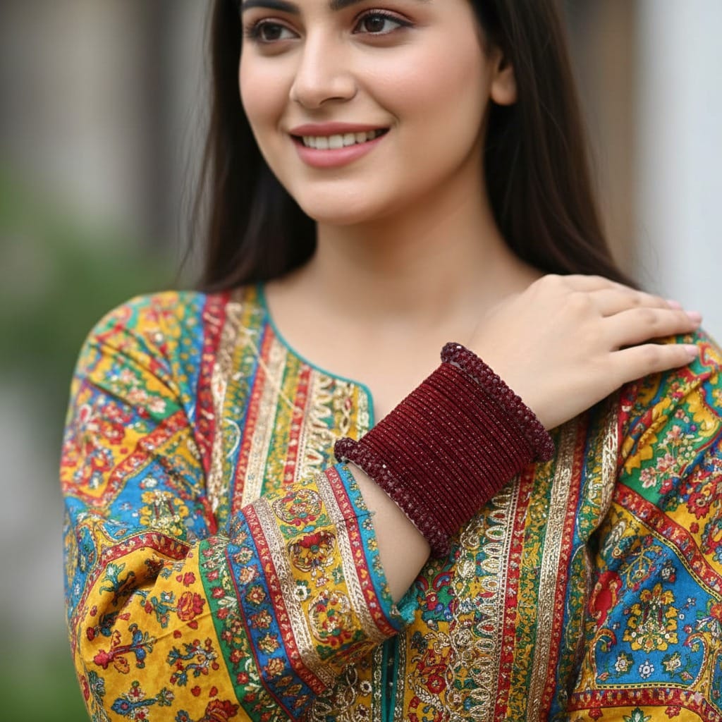 Turn heads with this luxurious set of deep maroon bangles, crafted with shimmering golden detailing and lined with rich crystal accents. The outer edges sparkle with finely set maroon stones, while golden flecks and intricate patterns lend the set a warm, opulent glow. Perfect for evening events, bridal wear, or festive gatherings, this bangle set adds depth, glamour, and sophistication to any traditional ensemble.